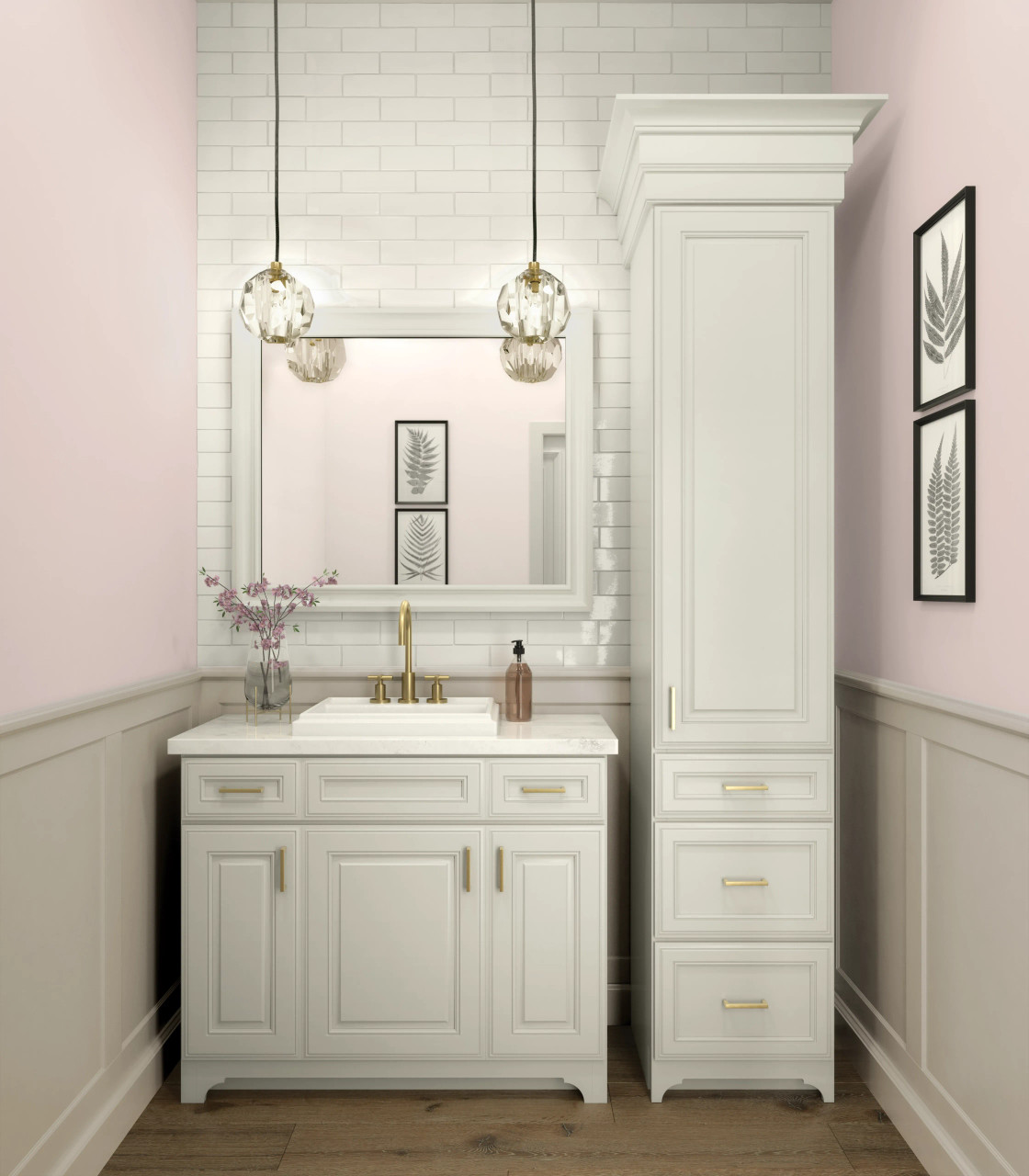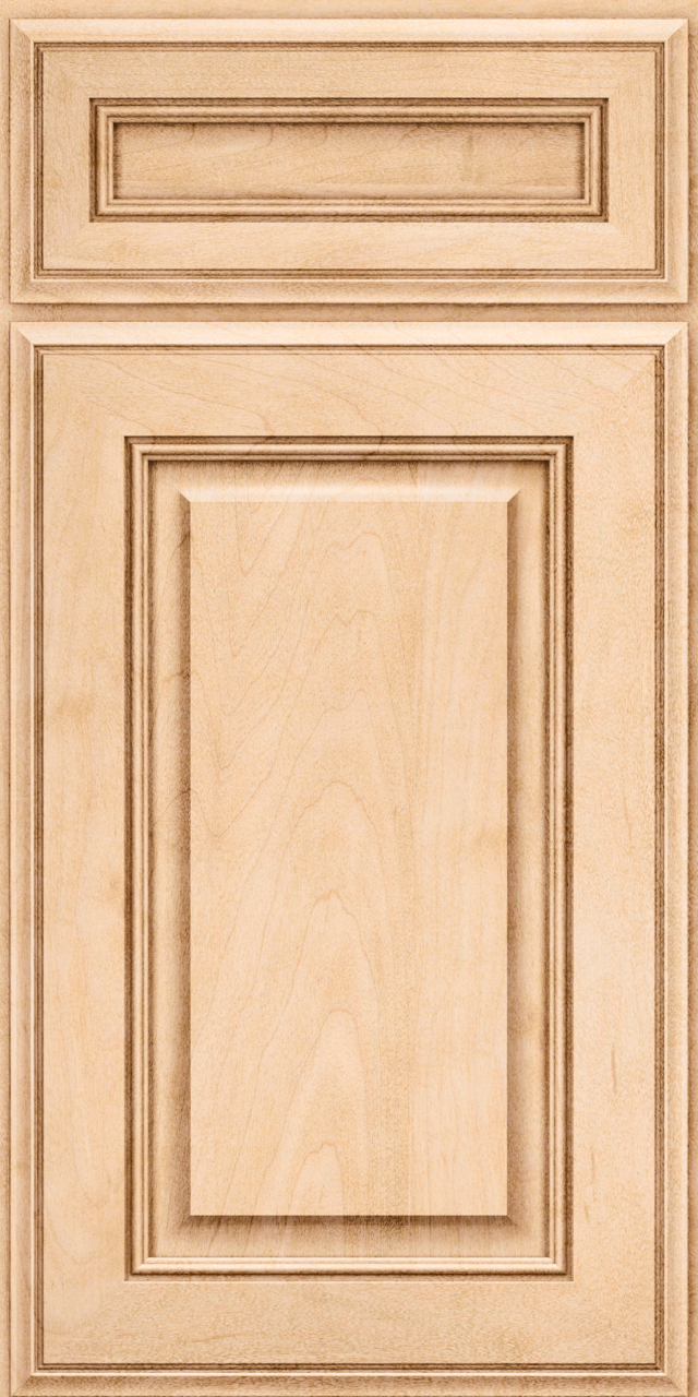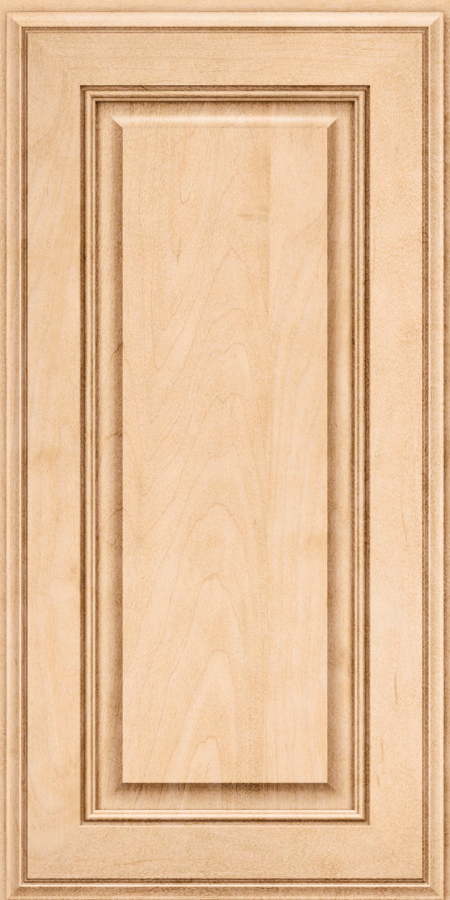 The raised panel cabinet door style places emphasis on the frame, where coordinating profiles are found on all edges of the 3″-wide mitered frame, while a cove creates the raised center panel.